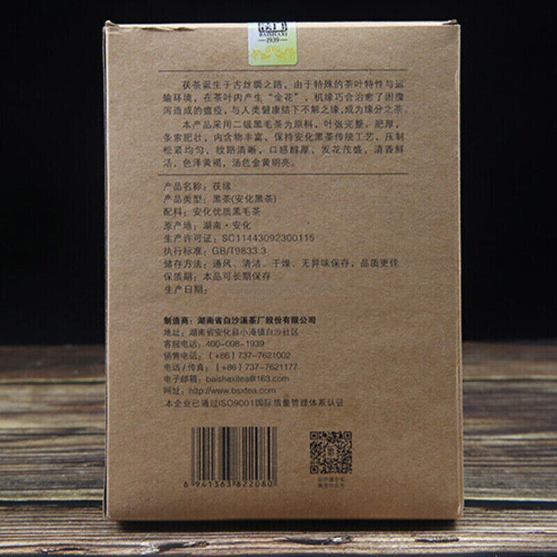 Product Name: Anhua Baishaxi Fuyuan Dark Tea Form: Compressed Brick Tea Origin: Hunan Province, China Tea Type: Dark Tea Package: Box Packing Net Weight: 750g Shelf life: The longer the better Storage Method: In ventilation, dry and no odor, storage in normal temperature environment . China Manufacturer: Hunan Provincial Baishaxi...