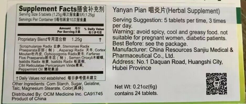 999 Yanyan Pian Herbal Supplement 24tablets 999咽炎片24片/盒
