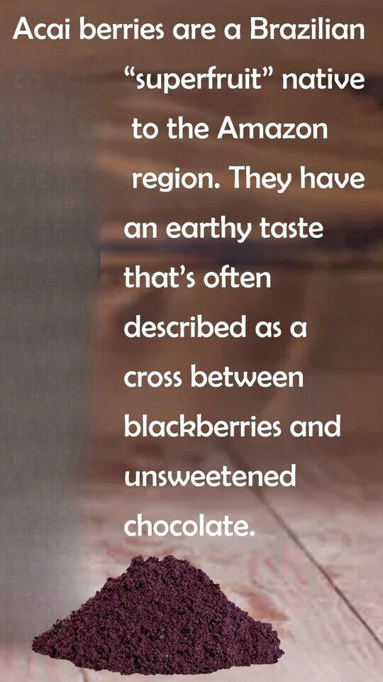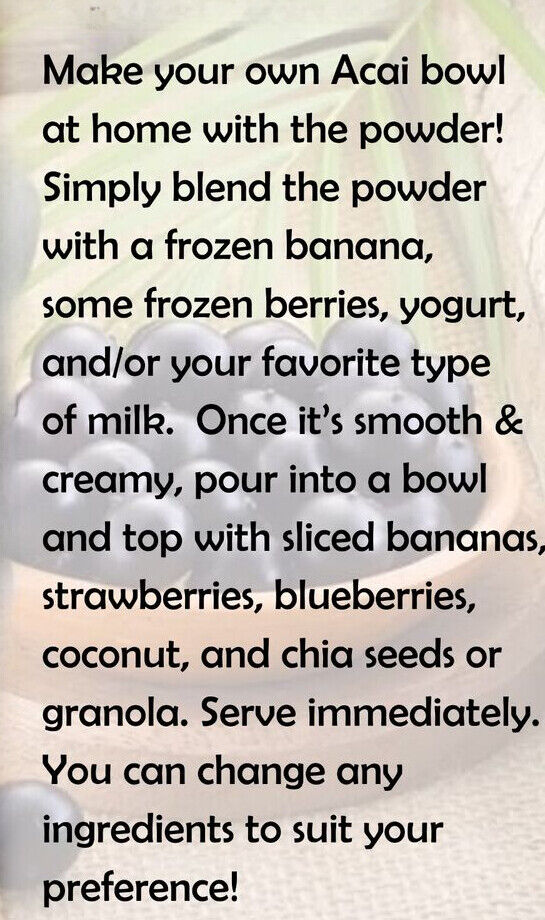 Organic Freeze Dried ACAI Berry Powder is All Natural 1.1 (17.6 oz. / 500 grams) Freeze Dried is the best way to get the most nutrients from this wonderful superfruit! Freeze Drying is a cool drying process that preserves the vitamins, minerals, antioxidants, and the beneficial nutrients in the Acai Berry. This process preserves almost all the delicate, beneficial ingredients of the Acai berry. Made from the Acai Berry Fruit with nothing added. Suggested Use: Mix about 1 1/2 tsp. of powder into juice, smoothies or your favorite drink.You may also sprinkle over yogurt, cereal or just about anything, or use for baking. Also great for making Acai Bowls.