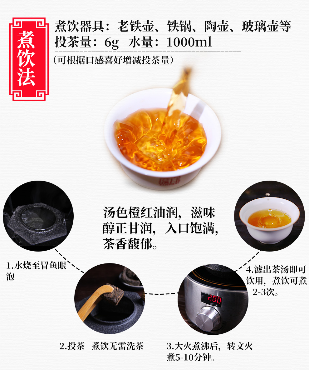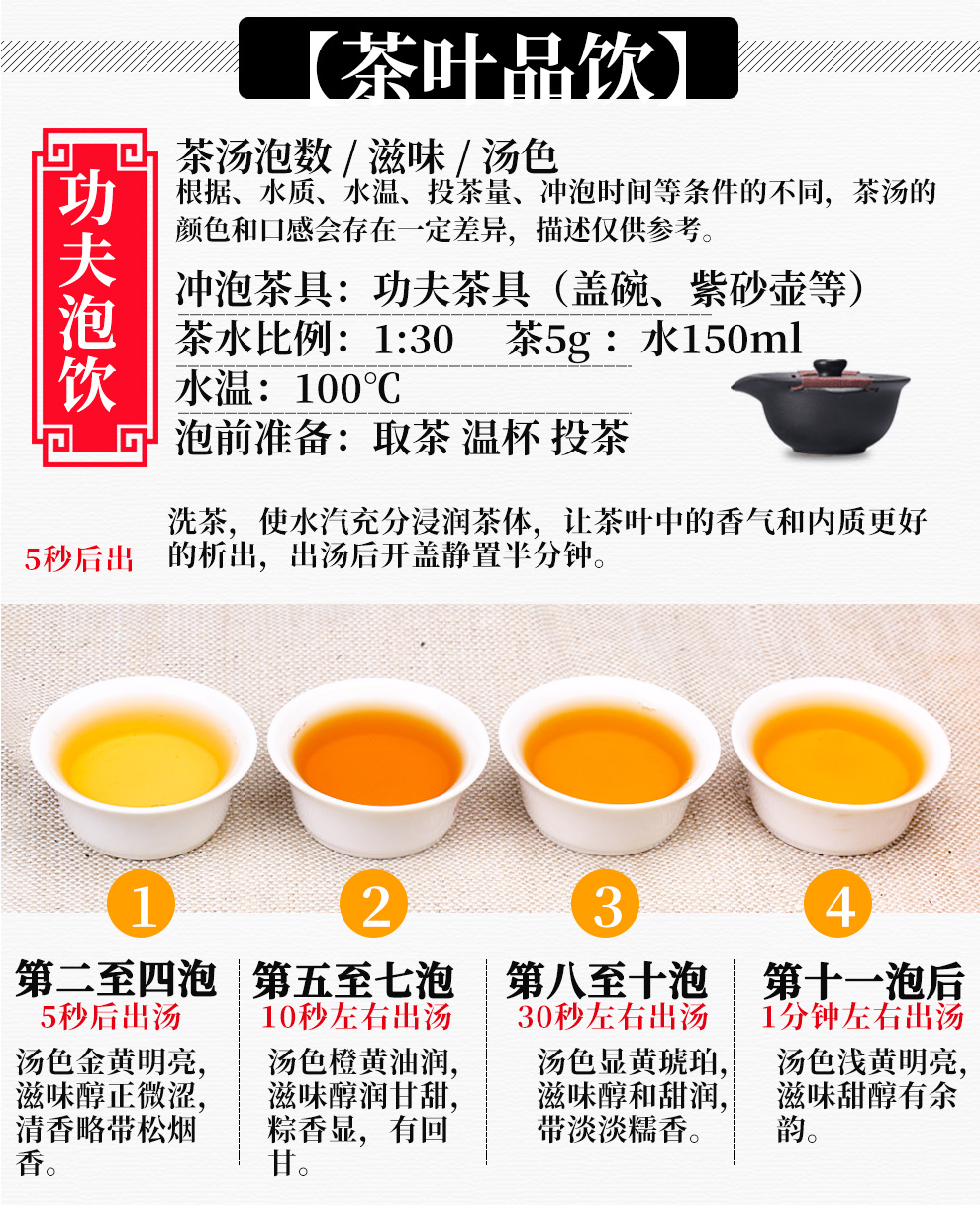 Dark yellow tea soup, full and sweet herbal flavor in mouth with light floral and nice aftertaste. This tea can be brewed for many infusions in gaiwan or cook for a long time without astrigency or bitter.