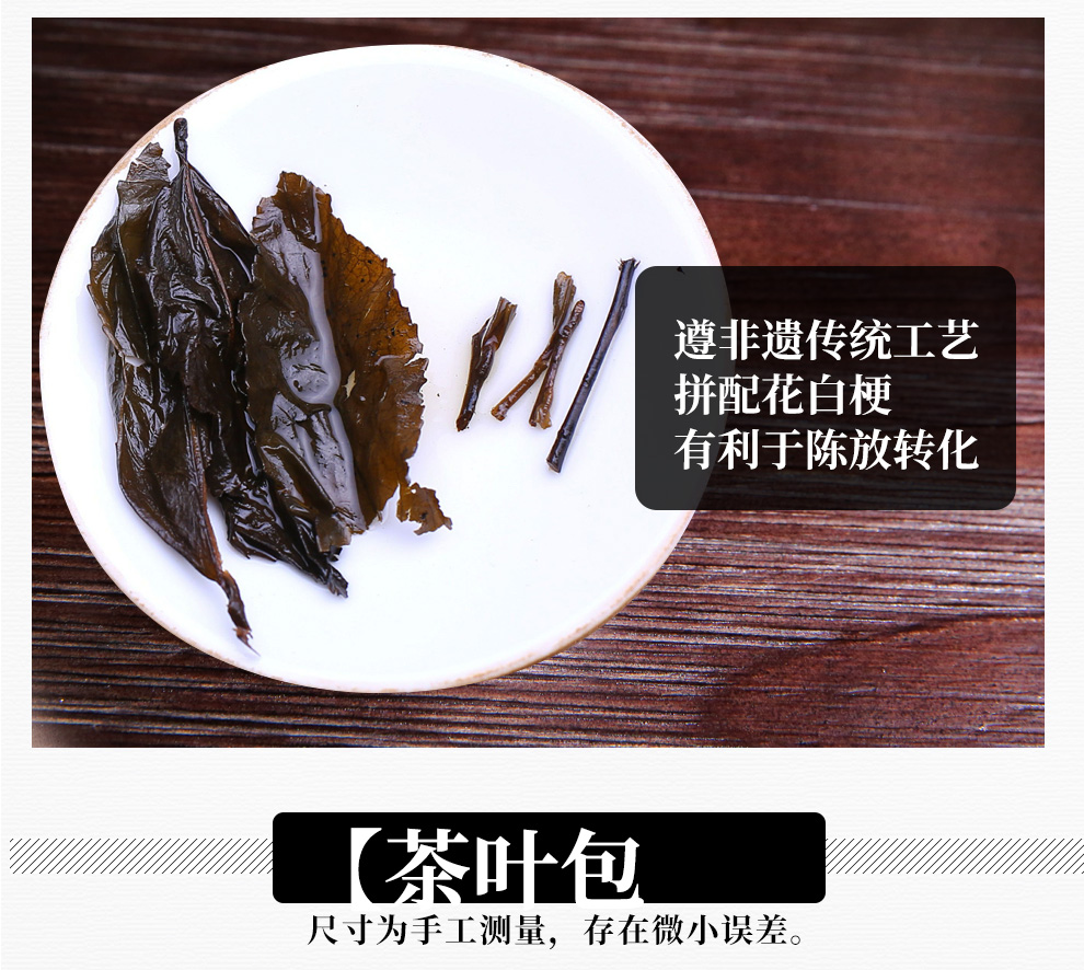 so named Hua Juan Tea) is a special compressed Heicha from Anhua County, Hunan province. Hua Juan Tea has various sizes: Qian Liang Cha (36.25kg per strip), Bai Liang Cha(3.625kg per strip), Shi Liu Liang Cha 0.5kg per strip), Shi Liang Cha(0.3625kg per strip). The tea is packaged to cylinder shape with palm and bamboo-woven baskets. This tea was stored in Hunan and later in Guangdong heicha tea seller warehouse.