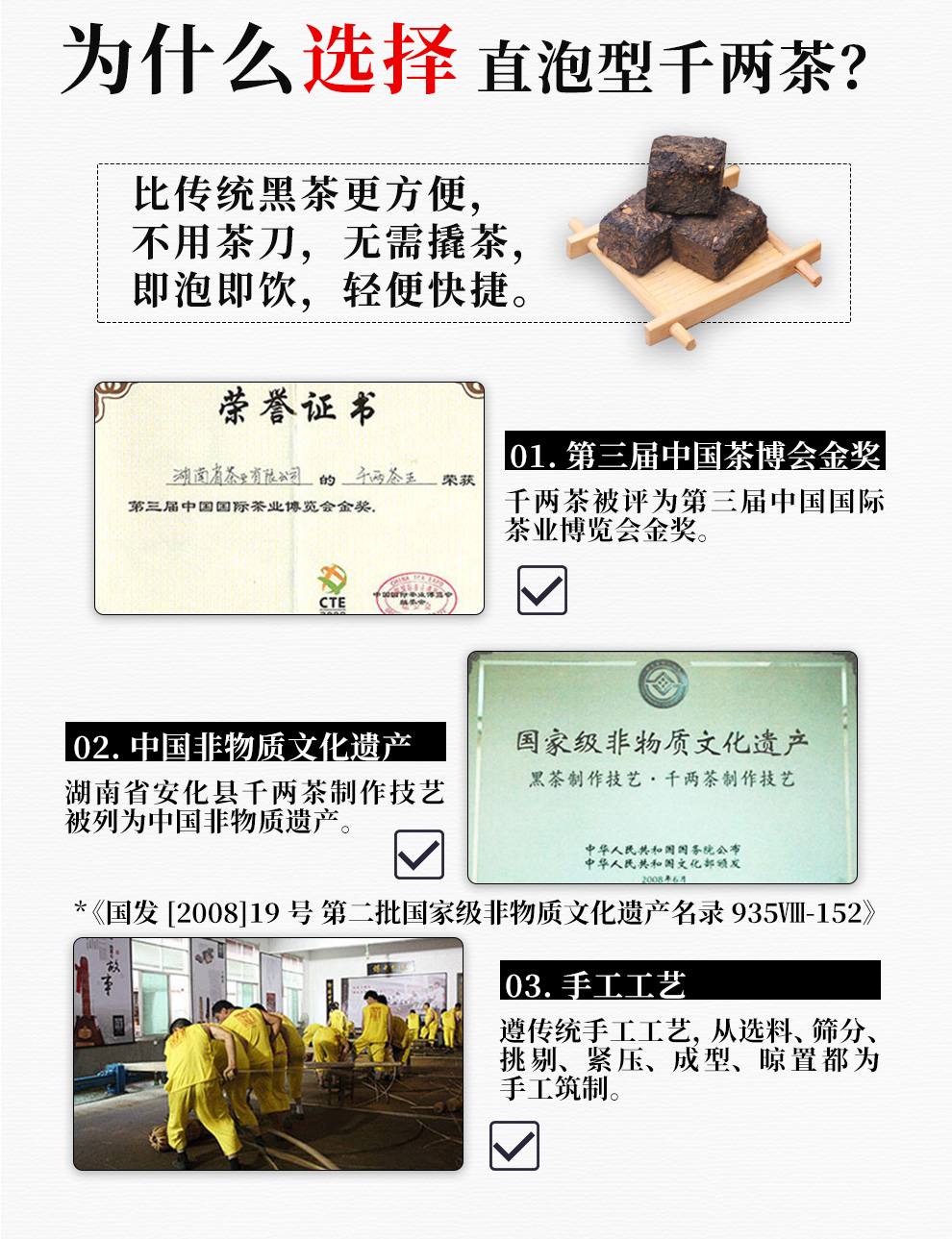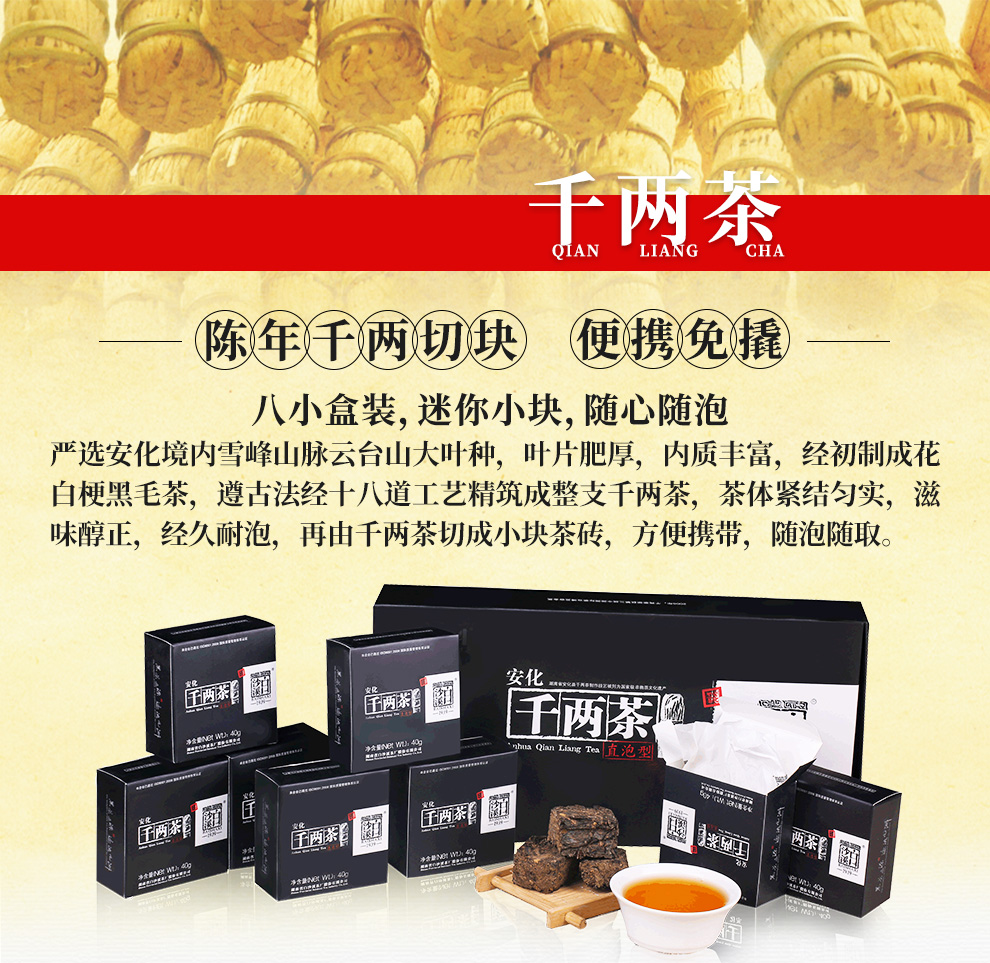 Type: Dark Tea Net Weight: 320g Packaging: Box Origin: China Description: Qian Liang Cha (also named Hua Juan Tea) is a special compressed Heicha from Anhua County, Hunan province. Hua Juan Tea has various sizes: Qian Liang Cha (36.25kg per strip), Bai Liang Cha(3.625kg per strip), Shi Liu Liang Cha...