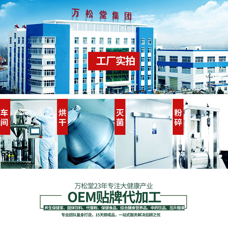 26年+ 历史 定制代加工(万松堂大健康产业集团),工厂资质齐全,通过国际HACCP,FSSC22000 ,ISO22000,ISO9001等认证,有出口资质,出口产品量大可协助商检报关退税。