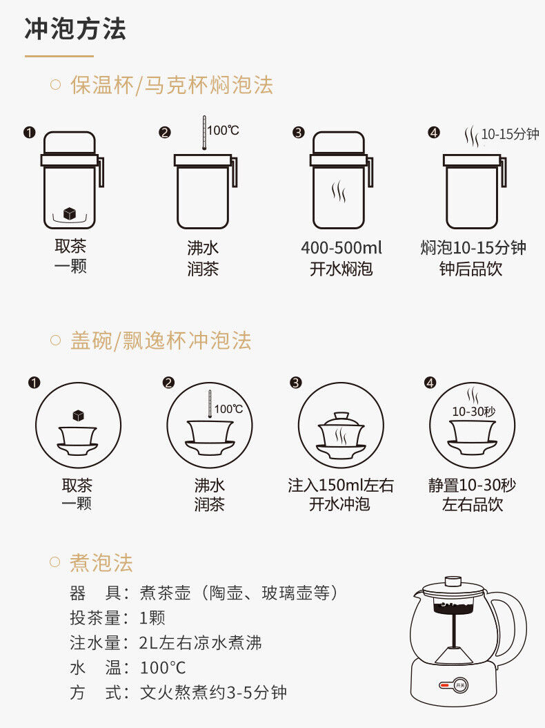 Brewing method: use tea knife take 10-15g tea from the brick, put it in 500ml boiling water for 3 mimutes, serve it immediately.