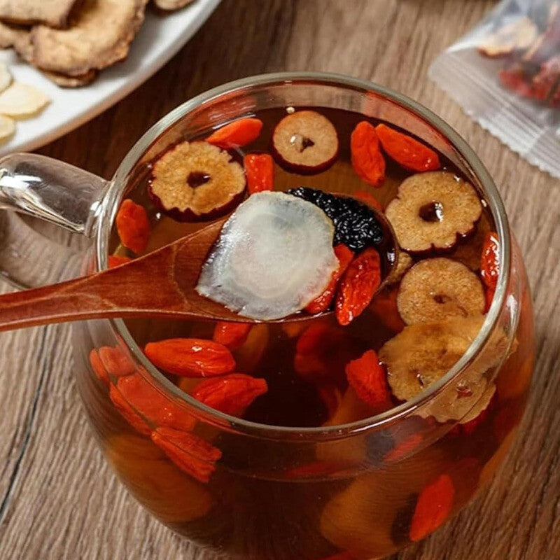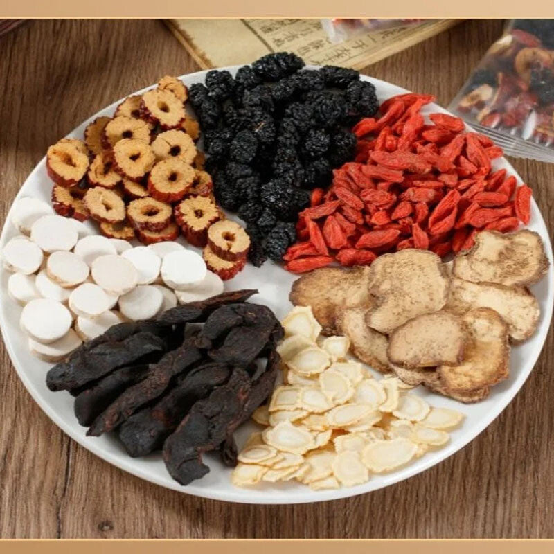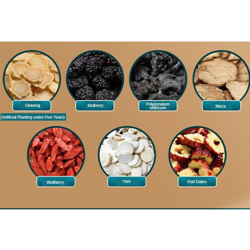 Ingredients: Yellow essence, mulberry, Tuckahoe, Wolfberry, Raspberry, yam, cinnamon, ginseng, maca powder, jujube