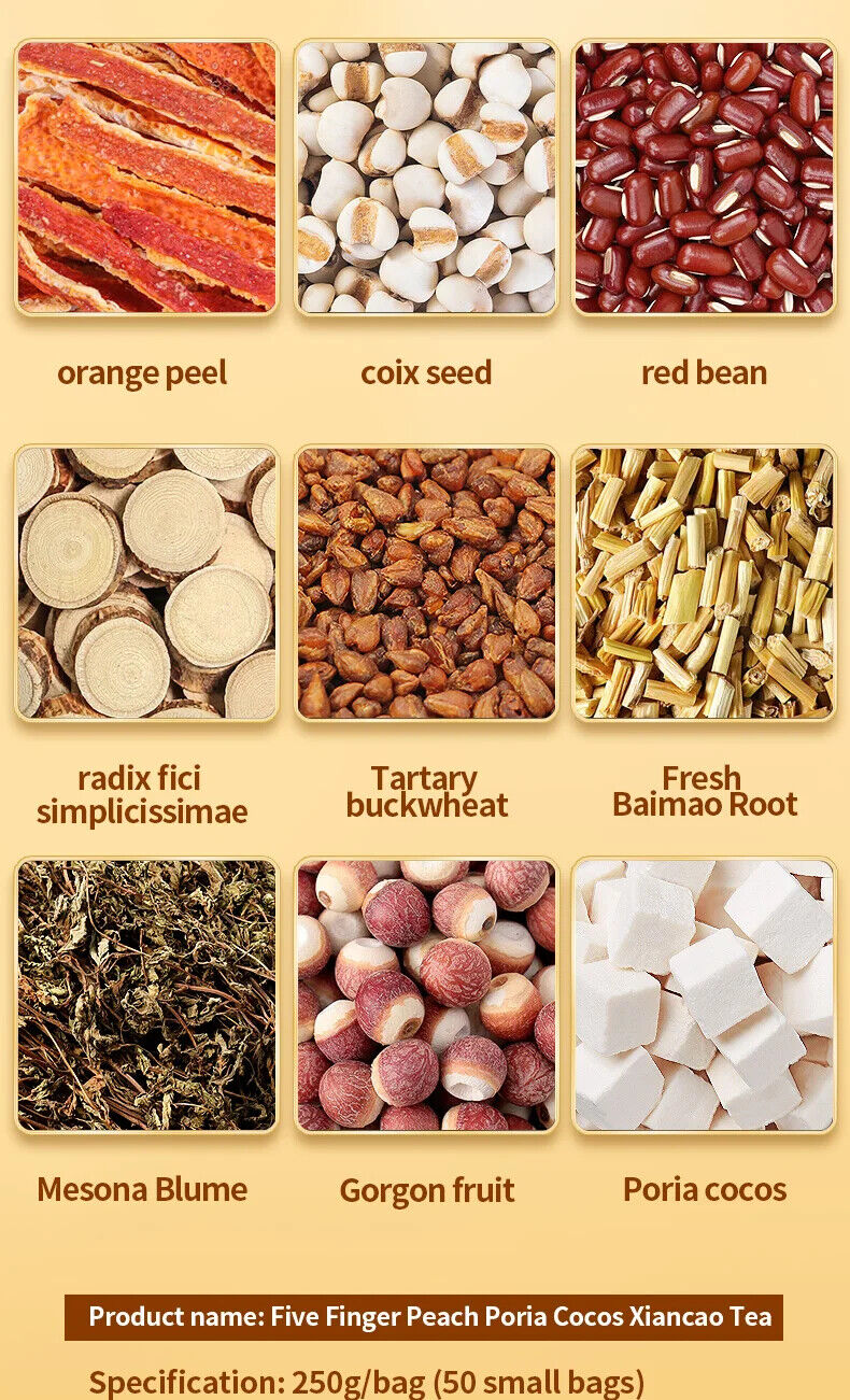 Product name: Five Finger Peach Poria Cocos Xiancao Tea Specification: 250g/bag (50 small bags) Ingredients: Orange Peel, Coix Seed, Red Bean, Five Finger Peac h, Tartary Buckwheat, Fresh Baimao Root, Cold Powder Grass, G orgon Fruit, Poria Cocos Shelf life: 18 months Storage: Store in a cool and dry place...