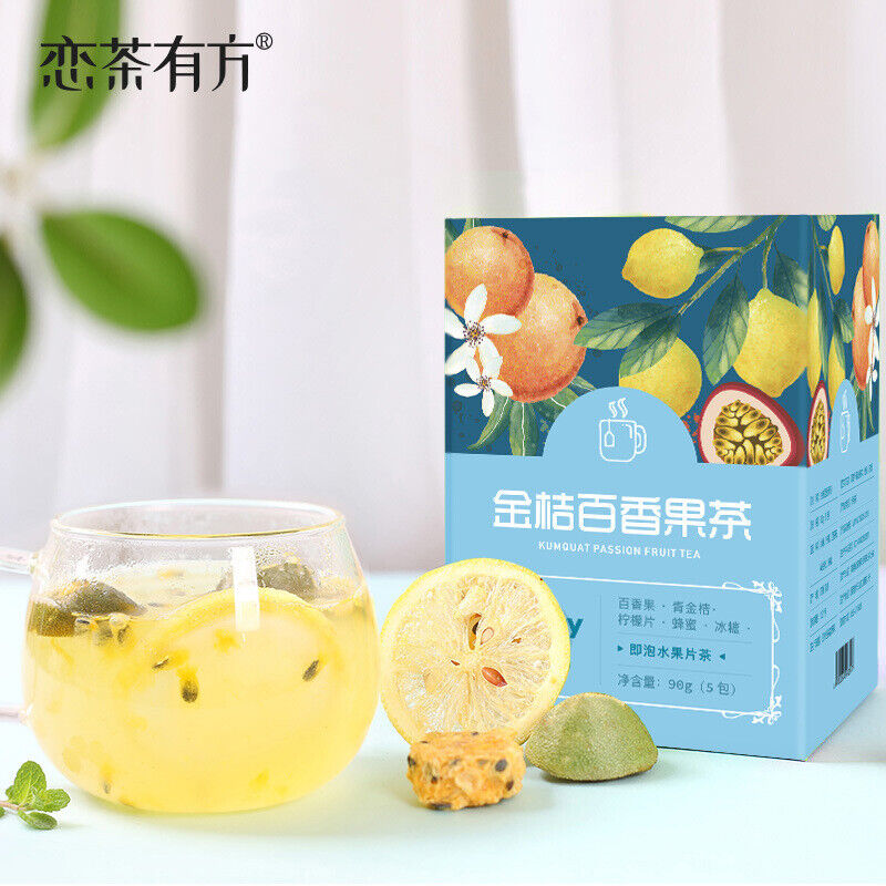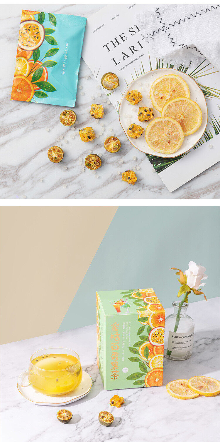Freeze dried citrus, passion fruit, honey tea, lemon slices, flower fruit tea
