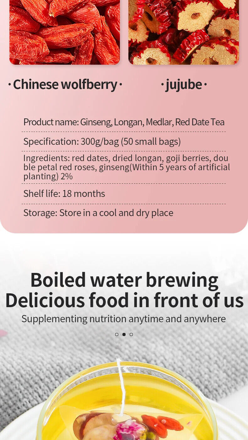Product name: Ginseng, Longan, Medlar, Red Date Tea Specification: 300g/bag (50 small bags) Ingredients: red dates, dried longan, goji berries, dou ble petal red roses, ginseng(Within 5 years of artificial planting) 2% Shelf life: 18 months Storage: Store in a cool and dry place This product adopts a triangular tea...