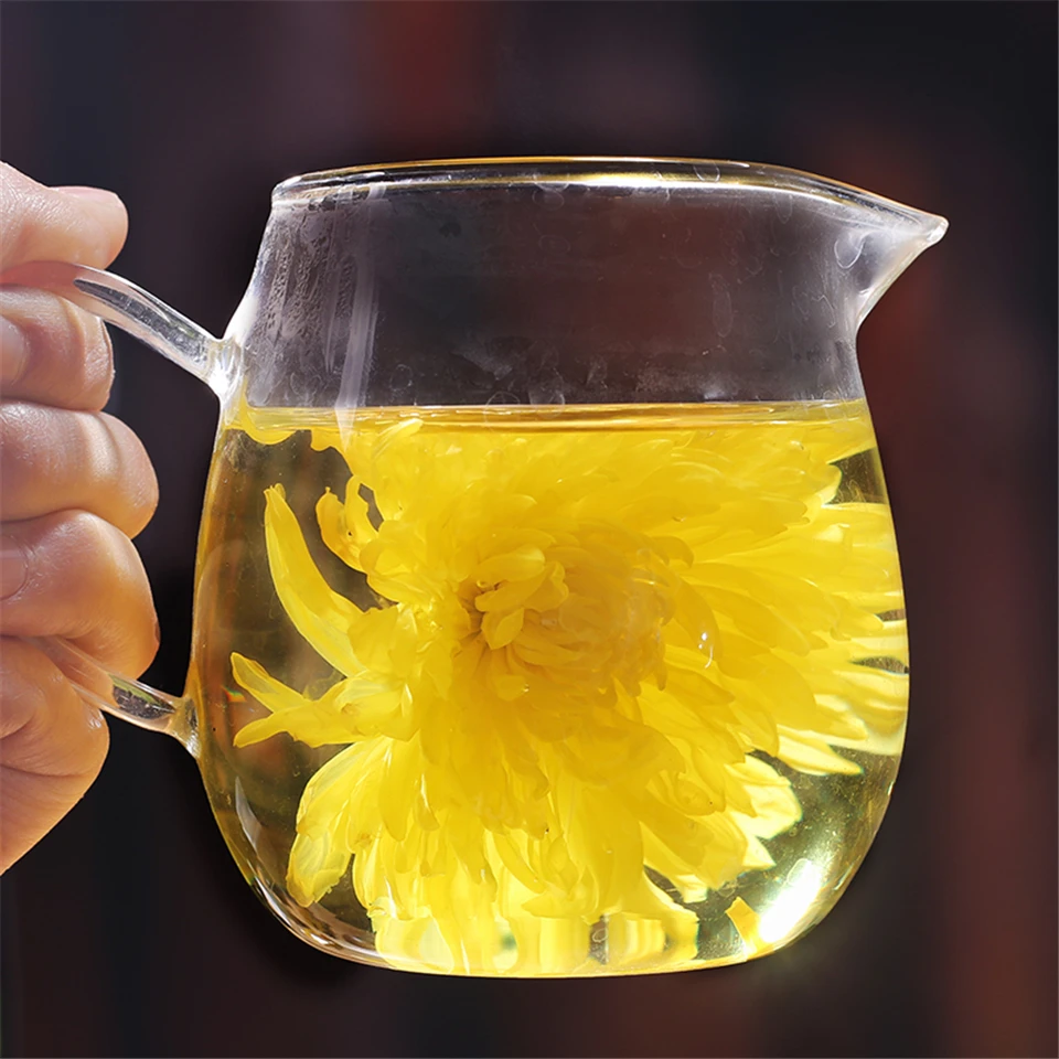 Brewing Guide: To prepare the tea, chrysanthemum flowers are steeped in hot water (usually 90 to 95 degrees Celsius after cooling from a boil) in either a teapot, cup, or glass; often rock sugar or cane sugar is also added, and occasionally also wolfberries. The resulting drink is transparent and ranges from pale to bright yellow in color, with a floral aroma. In Chinese tradition, once a pot of chrysanthemum tea has been drunk, hot water is typically added again to the flowers in the pot; this process is often repeated several times. Chrysanthemums are also steamed or boiled and eaten in salads. The leaves are particularly appreciated as a vegetable dish. Flowers and leaves may be added to stews or soups in Asian cuisine as it is said to help thicken the liquids.