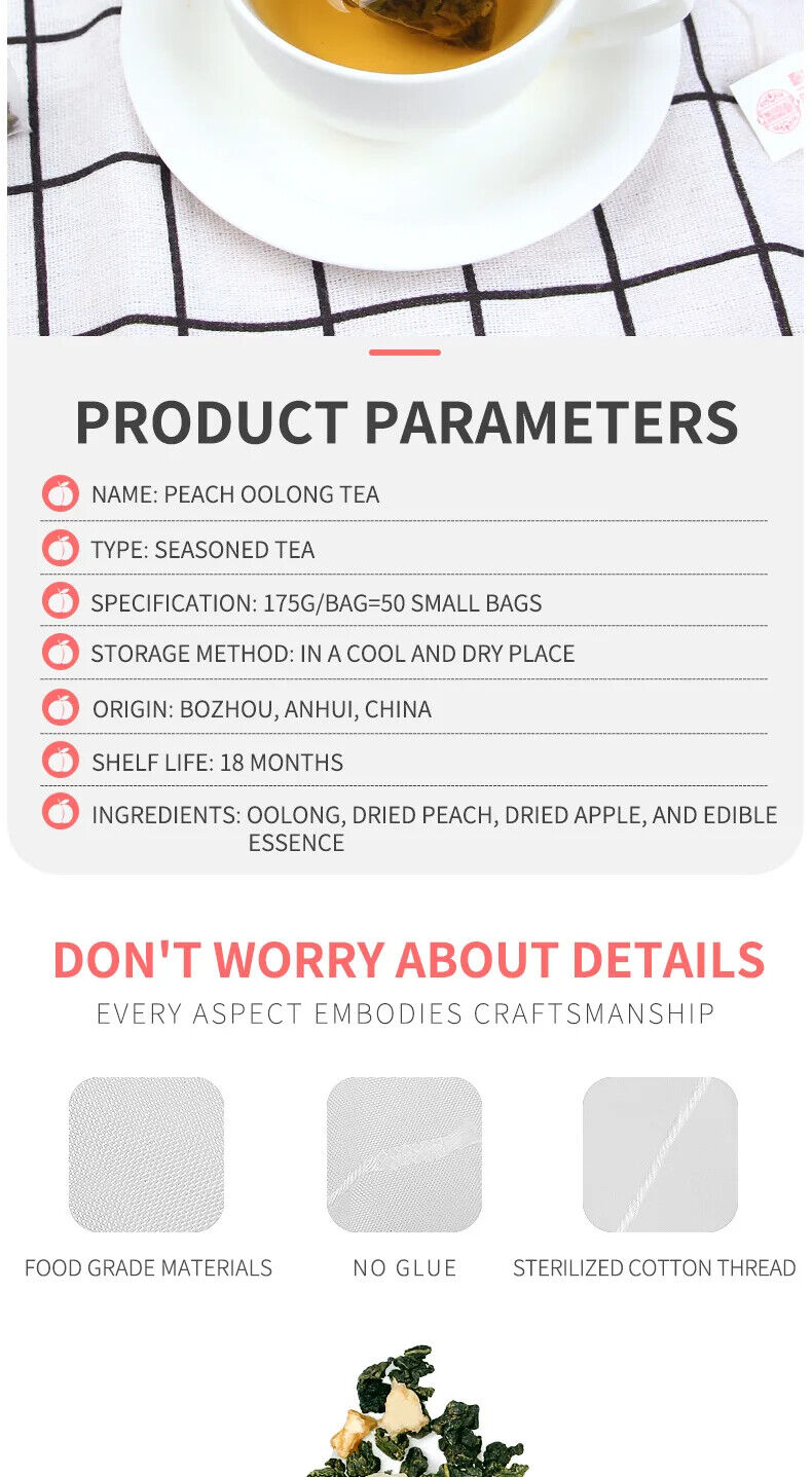 Ingredients: Oolong, dried peach, dried apple, and edible essence