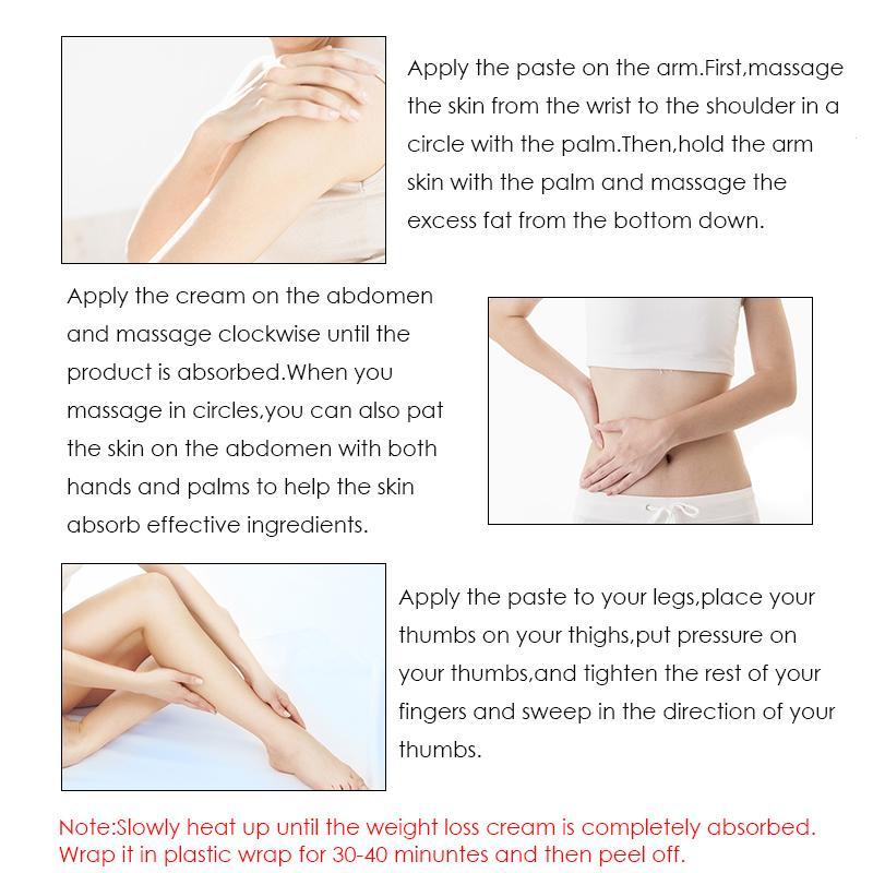 How to use: Apply a proper amount of slimming cream to the area for massage. Heat slowly until the weight loss cream is completely absorbed. Wrap in plastic wrap for 30-40 minutes and start.