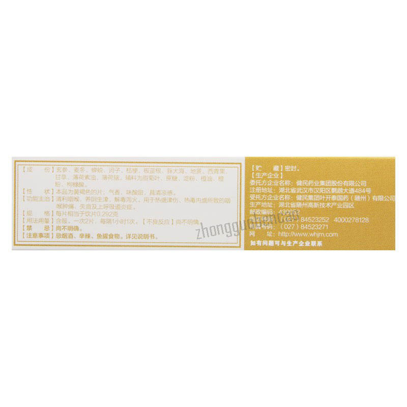 Two types of packaging are randomly shipped. 健民咽喉片 每盒16片 1盒装 保质期36个月 Item: Jianmin Yanhou Pian Quantity/Box: 16 Tablets Shelf Life: 36 Months Package Included: 1 Box of Jianmin Yanhou Pian