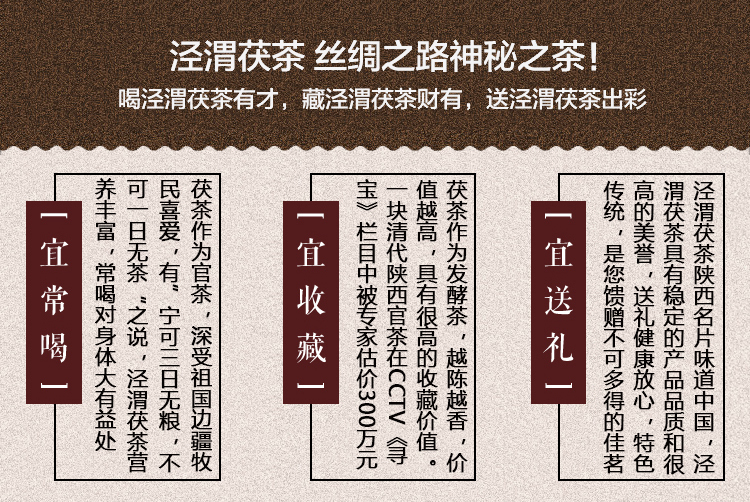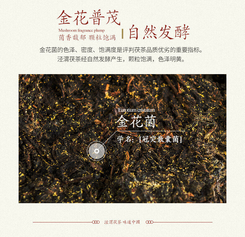 Product Description: Fu Tea was invented by Xianyang people of Shanxi Province with a special processing technique in 1368. Ancient merchants in China brought Fu Tea to Central Asia, West Asia, Europe and beyond along the Silk Road. Fu Tea is fully fermented. After three sessions of fermentation, the fu tea will naturally grow a kind of probiotic which is good for health.