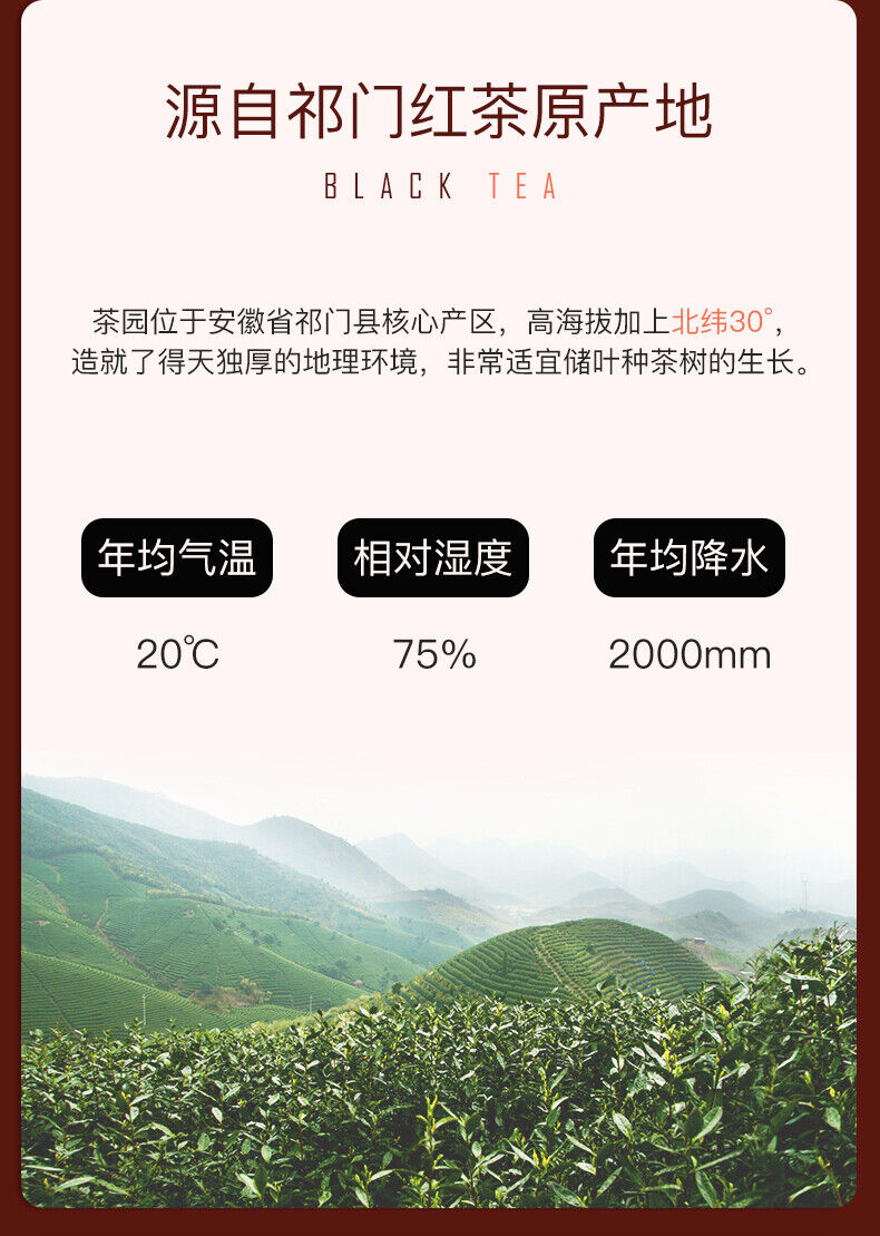 Keemun, the southern-most county of Anhui province where Keemun Black tea is produced, is situated at 29'55'' North Latitude and 119'50'' East longitude, with an average elevation of about 400 metres and a climate bordering on that of subtropica. Such a natural environment, favorably endowed with a temerate cilmate, plentiful rainfall and cloud-encircling dense forests on peaks where tea -- growing spots are, has been the vital factor that nurtures the typical quality of Keemun Black Tea.