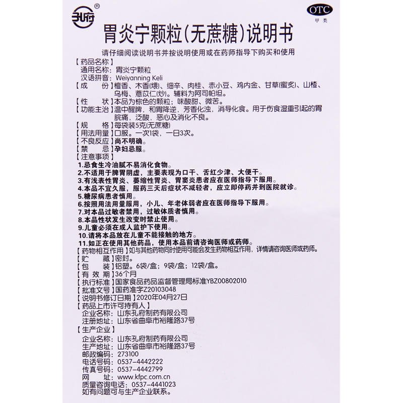Kongfu Stomach Inflammation Granules 5g*6bags/box OTC 孔府 胃炎宁颗粒 5g*6袋/盒 OTC