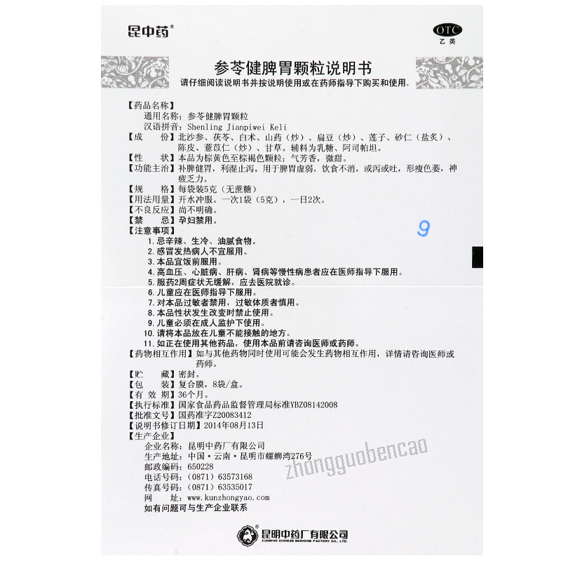 昆中药参苓健脾胃颗粒 每盒8袋 1盒装 保质期36个月 Item: Kunzhongyao Shenling Jianpiwei Keli Quantity/Box: 8 Bags Shelf Life: 36 Months Package Included: 1 Box of Kunzhongyao Shenling Jianpiwei Keli