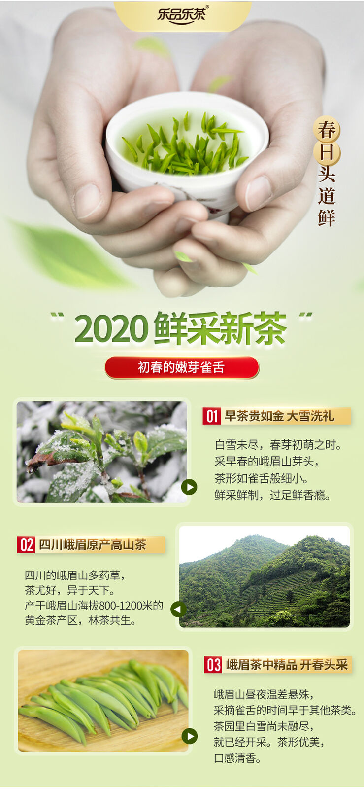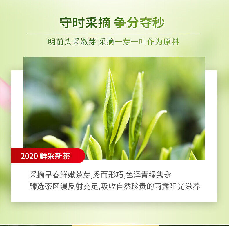 Tea planting in Mt.Emei started in the Jin Dynasty (265-420). The fresh leaves of the Que She Tea are normally picked 3 to 5 days before pure brightness. The picking is done when the first bud and first leaf or the first bud and the first two leaves begin to open. The buds and leaves should be tender and even and in the same size. The finished tea has a flat and smooth appearance.
