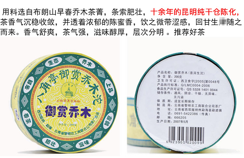 Tea Type: Puer Raw Tea Net weight: 200g/pc, Price for one pc ONLY. Production Date: 2007 Origin: Menghai,Yunnan,China Manufacturer: Yunnan Liming Agriculture,Industry&Commerce Associated Co.,Ltd.Tea Factory . |