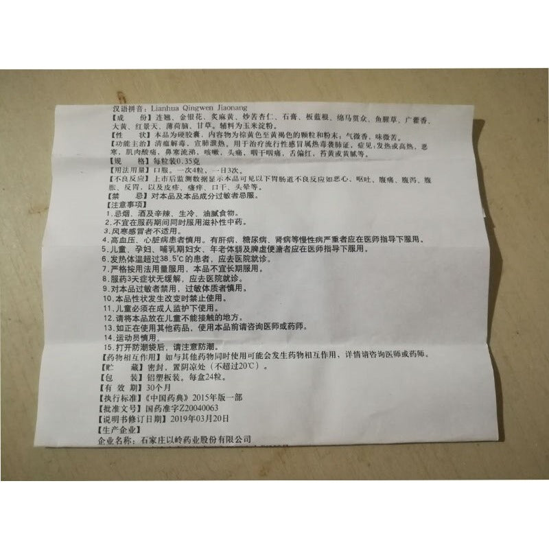 Product description: (Copy Manual from the manufacturer) [Brand] YILING [Manufacturer] Shijiazhuang Yiling Pharmaceutical Co. Ltd [Name] Lianhua Qingwen Jiaonang [Ingredients] Weeping Forsythia Capsule, Japanese Honeysuckle Flower, Ephedra Herb(honey-fried), Bitter Apricot Seed(stir-baked), Gypsum, Isatis Root, Male Fern Rhizome, Heartleaf Houttuynia Herb, Cablin Patchouli Herb, Rhubarb, Bigflower Rhodiola Root, Menthol, Liquorice Root....