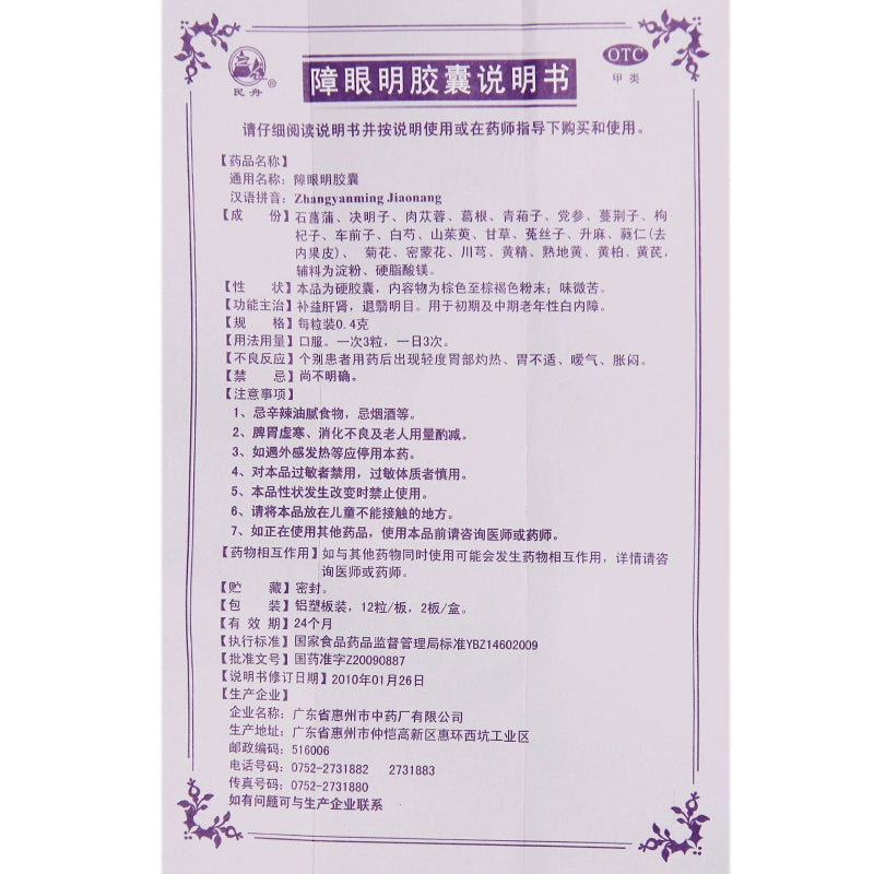 Min Zhou Blindspot Capsules 0.4g*24 capsules/box OTC 民舟 障眼明胶囊 0.4g*24粒/盒 OTC