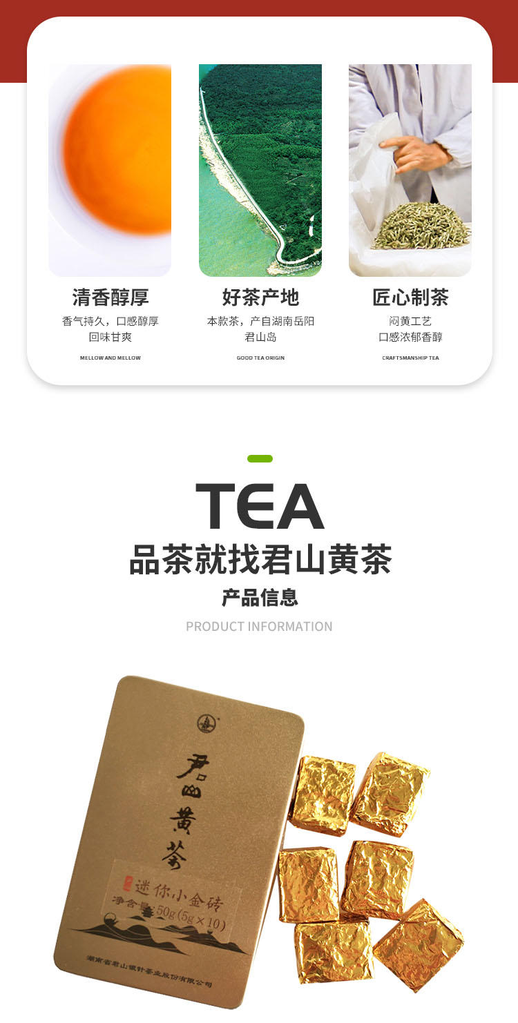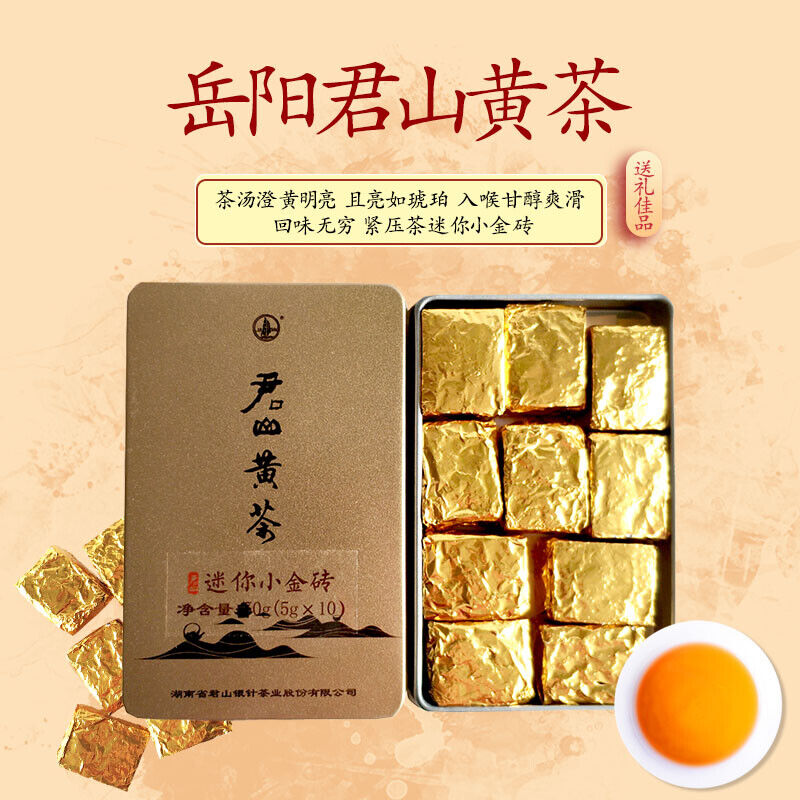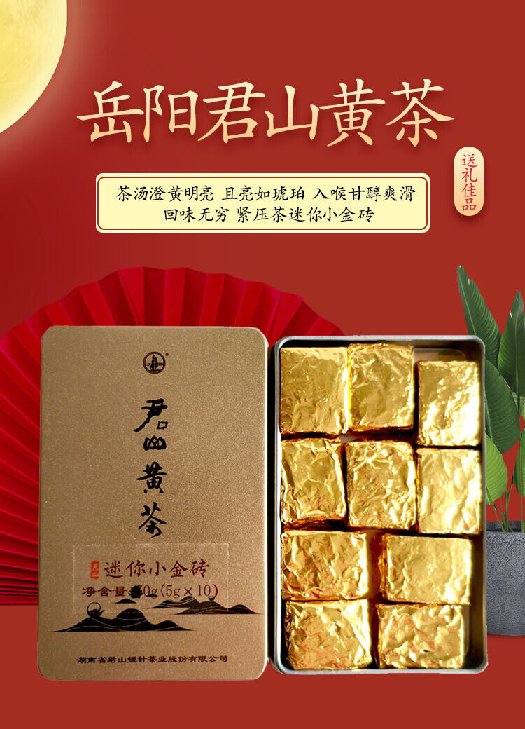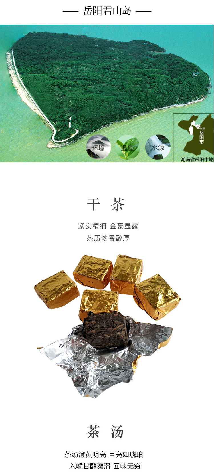 Type: Yellow Tea Net Weight: 50g (5g x 10 pcs) Packaging: Box Origin: Yueyang,Hunan,China Description: Jun Shan Huang Cha tea is a yellow tea from Junshan Island of the Hunan Province in China. It is one of Chinese Famous Teas. Junshan yellow tea is only produce using the tea leaves from the tea garden at the Junshan Island, which is located in the middle of Dong Ting Lake of Hunan Province. The best quality Jun Shan tea is called as Jun Shan Yin Zhen. The production of Jun Shan Yin Zhen demands that tea pickers pluck only buds while the golden brick is made with the material picked as one bud and one leaf system. Jun Shan yellow tea is processed similarly to green tea, but after the first firing it undergoes steaming followed by a prolonged “resting” wrapped in cloth or paper. This stage called men huan may last a day or two before the final firing. The moist pause allows the leaves to breathe back their own aromas and prevents the astringency associated with some green teas. It also gives the leaves a very slight yellow cast. The initial firing halts most of the oxidation, but similar to white tea it is very slightly oxidized.As a result, it produces bright yellow color, refreshing flavor and sweet and mellow taste that are the characteristics of yellow tea. Jun Shan Huang Cha is less expensive than Jun Shan Yin Zhen needle tea, first grade leaves harvested from the same area, followed by traditional process, you can try the famouse yellow tea at an affordable price. An authentic product from Hunan Junshan Yinzhen Tea Co., Ltd. Brewing Guide: Use each cake for 200ml of water. Quickly rinse the tea leaves with hot water at 80 degree Celsius, and then gently pour hot water at 80-85 degree C into the teapot, let it brew for 2 minutes. The leaves are good for 5 infusions. Add a little more time for each subsequent infusion.