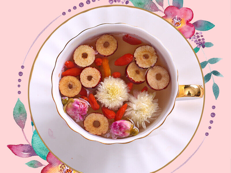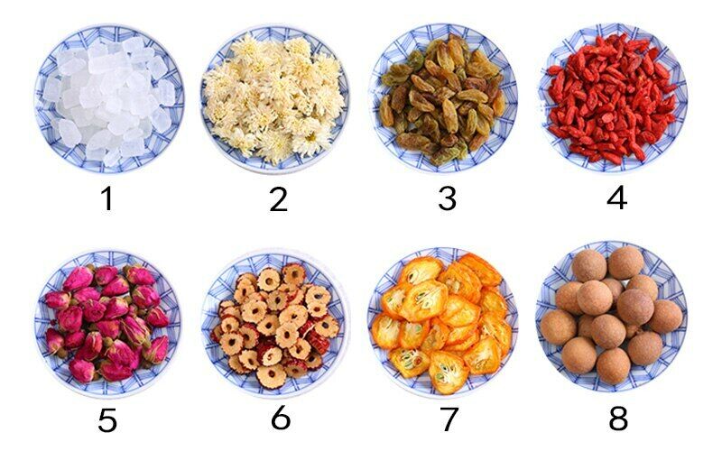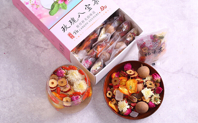 Tips: Please store tea on a dry and cold place.Ba bao cha, as its name, according to the tradition recipe, this herbal tea includes 8 kinds of material as follows: longan, jujube, goji berry, rose, chrysanthemum, raisin, dried kumquat, and rock candy, and they are packed separate, easy to take. Tea soup is clean, it smells a rose and chrysanthemum aroma, tastes fresh and slight sweet, the character of this tea is you will get a different taste from each sip. Function: Beauty skin, helps digestion, calming tea