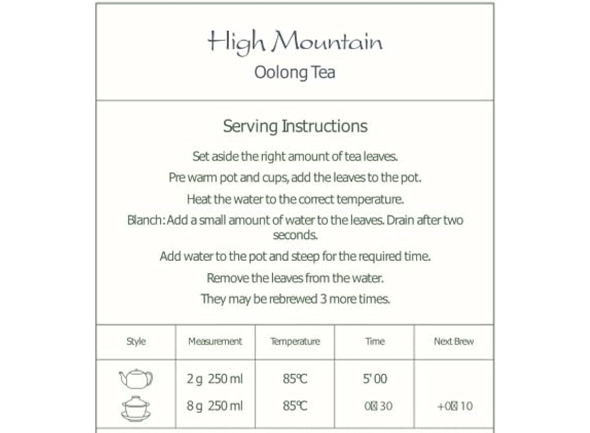 Taiwanese Oolongs are praised for their green, fresh and crisp tastes, and our High Mountain Oolong is no different. Once brewed, this tea is sweet and light enough for beginners, but with hidden depths that even a true tea connoisseur will appreciate.