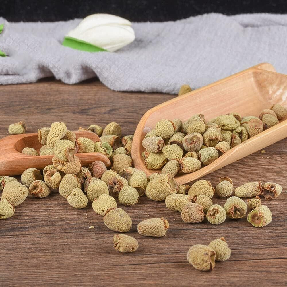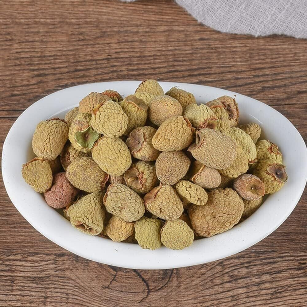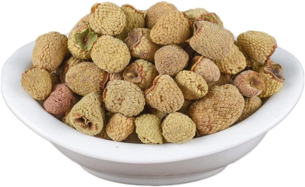 Raspberry is a aggregates fruit, formed by the aggregation of most small drupes, conical or oblate conical, 0.6 ~ 1.3cm in height, 0.5 ~ 1.2cm in diameter. The surface is yellowish green or light brown, the apex obtuse, the base concave center. Calyx is brown, fruity peduncle mark below. Small fruit is easy to peel off, each small fruit is half moon shape, the back is dense gray fuzz, on both sides of the obvious mesh, the abdomen has a protrusion of edges. Light body, hard quality. Slight gas, slightly sour taste.