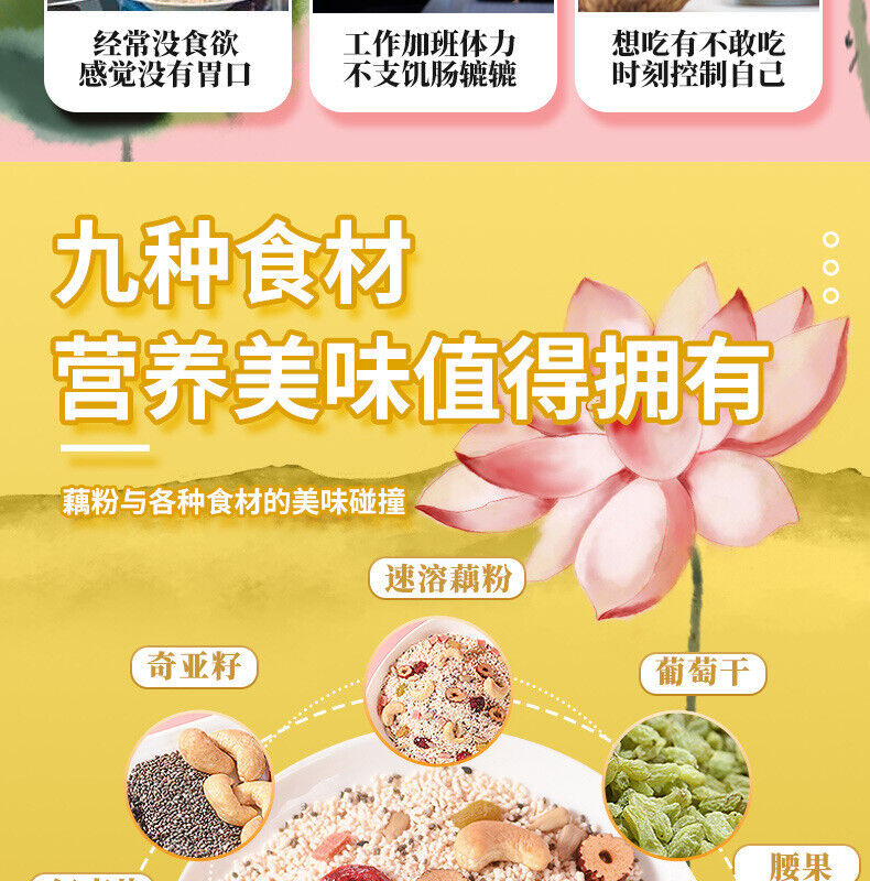 Main ingredients/ingredients: lotus root starch, black sesame seeds, dried red grapes, hawthorn slices, sunflower seeds, almonds, peanuts, walnut kernels, sweet-scented osmanthus, cranberries, rock sugar powder.