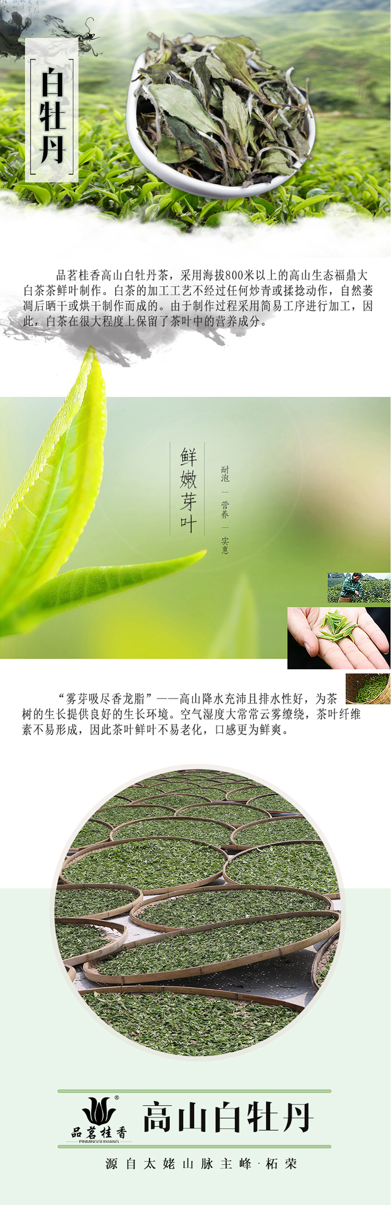 The processing rules require this tea only be picked between March 15 and April 10. It is not picked on days that may be raining or if the dew has not dried or if there is frost on the ground. No purple buds are allowed and the stems must not be too long or too short. Leaves damaged by wind, handling, insects or partially open are rejected and put into a lower grade. The best Bai Mu Dan is produced using the two leaves and a bud proportion and is naturally or mechanically withered to produce leaves that are not black or red but green in color.