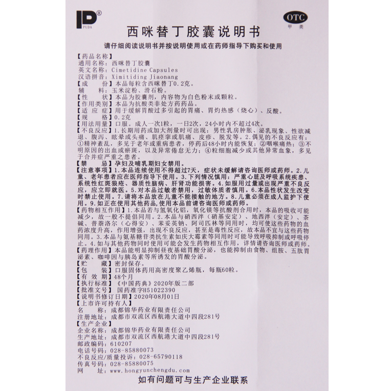 PUDA Cimetidine Capsules 0.2g*60 capsules*1 bottle/box OTC PUDA 西咪替丁胶囊 0.2g*60粒*1瓶/盒 OTC