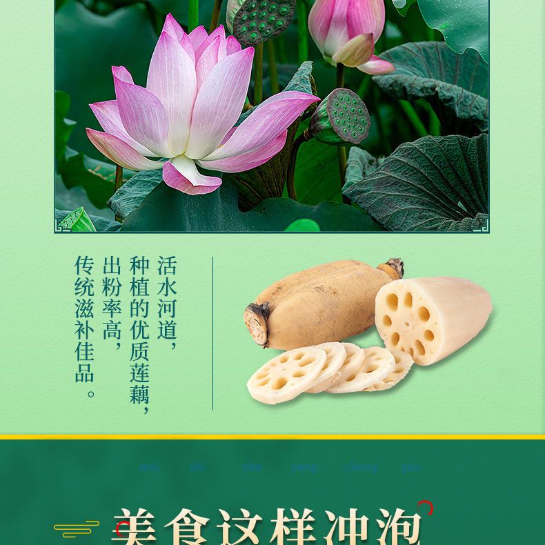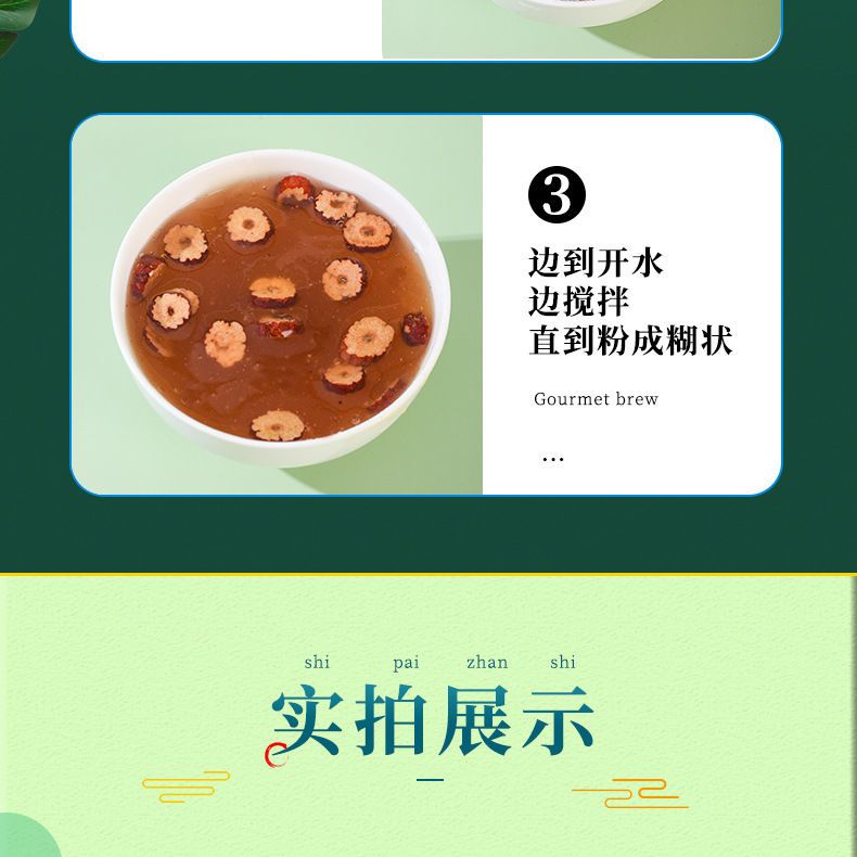 Eat: brew in boiling water. Step 1: Take a bag of this product and pour it into a cup; Step 2: First add a small amount of warm water to dissolve the lotus root starch, and stir well; Step 3: Pour the boiling water that has just boiled at one time, and add the boiling water while stirring (remember that it must be scalding hot) until it becomes a paste. Note: The first time is to heat the water, and the second time is to heat the boiled water.