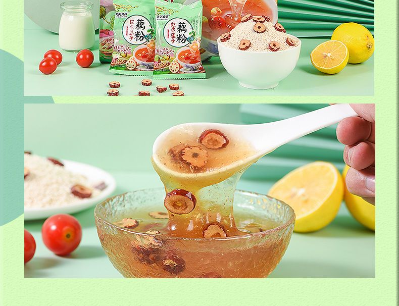 Features: When the red dates meet the fragrant lotus root starch, the taste is smooth. The color of the lotus root starch will change rapidly with the amount of water added, and finally it will become a light and transparent gel like agate jelly. Lotus root starch is warm in nature, rich in nutritional value, and more comfortable for the stomach.