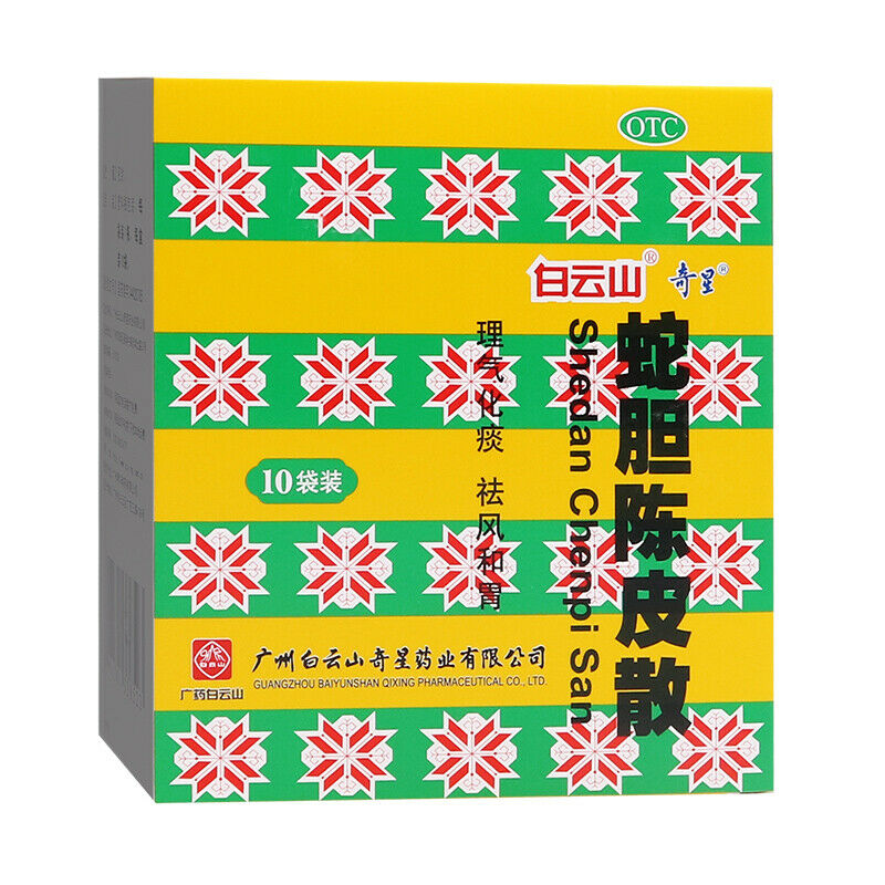 蛇胆陈皮散 产地: 中国 制造商: 中国广州白云山奇星药业有限公司 规格/净含量:每瓶装: 0.6g 主要成分: 蛇胆汁、陈皮。 功能主治:理气化痰,祛风和胃。用于痰多阻肺,胃失和降,咳嗽,呕逆。 用法用量: 口服,开水送服,每日2-3次,每次0.3g - 0.6g. 注意事项: 请将该产品放于儿童接触不到的地方。 suitable for symptoms such as weak phlegm in the lungs, colds and coughs, acute and chronic bronchitis coughs, lung heat and dry coughs, as well as sandy throat, dry throat, rising bad breath,...