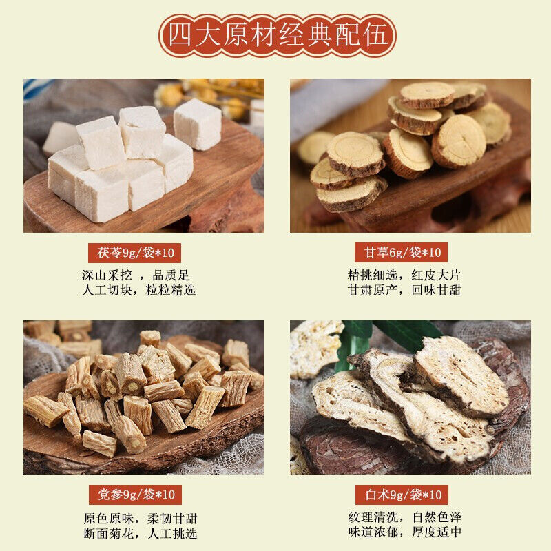 【配料】:党参(9g)、白术(9g)、茯苓(9g)、甘草(6g)每种独立包装
