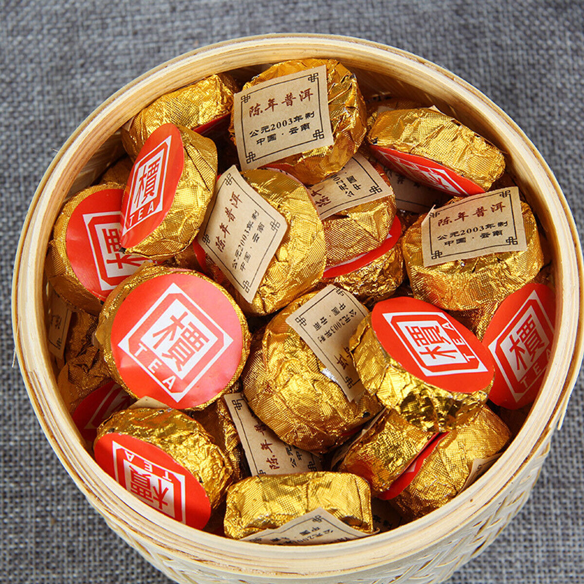 C-PE361 High Quality Pu'er Cooked Tea Small Golden Cake Old Ripe Puer Premium Small Bamboo Basket 500g