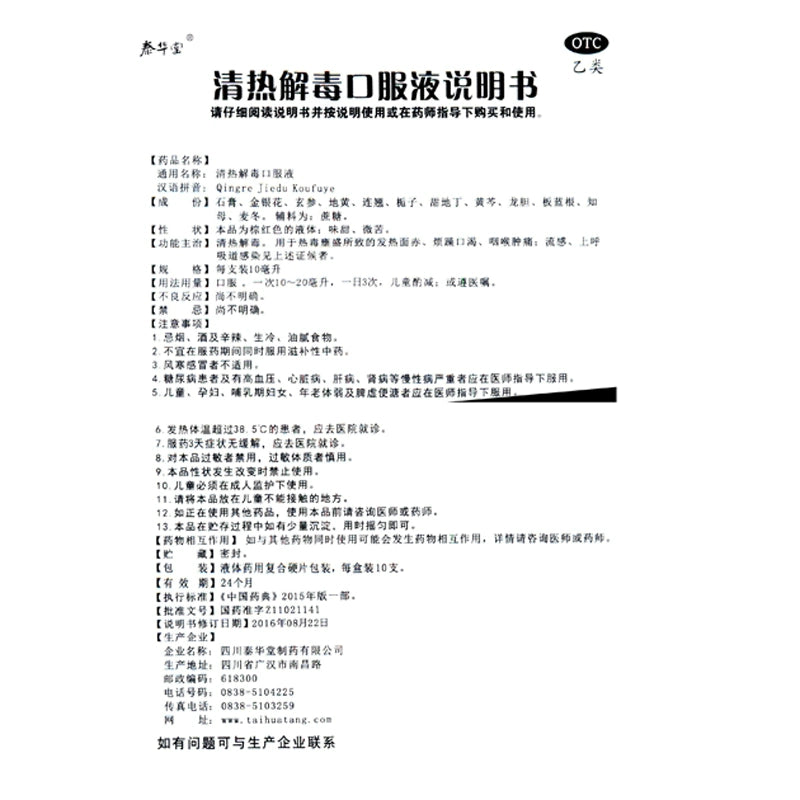 Tai Hua Tang Oral Liquid for Clearing Heat and Removing Toxins 10ml*10pcs/box OTC 泰华堂 清热解毒口服液 10ml*10支/盒 OTC