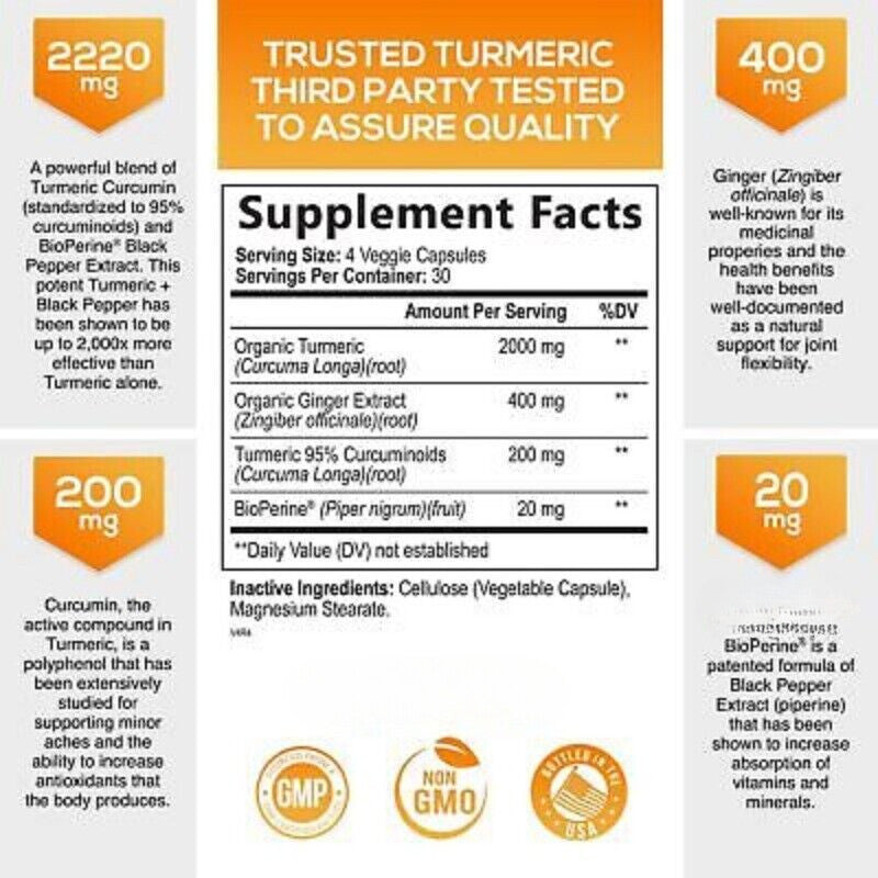 •  Trusted Formula: Our Turmeric Curcumin is formulated and manufactured following strict cGMP guidelines; Our Turmeric Curcumin Supplement is third party tested to assure the quality and purity of each batch