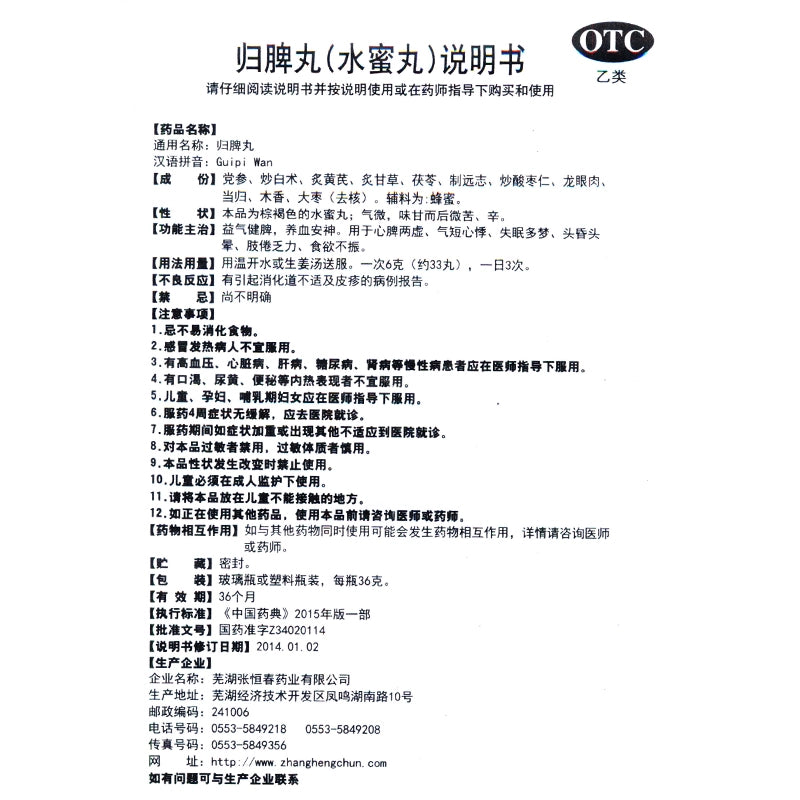 Zhang Hengchun Huisheng Pills 36g*1 bottle/box OTC 张恒春 归脾丸 36g*1瓶/盒 OTC